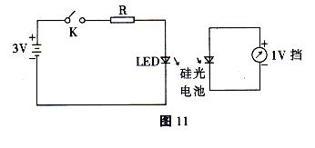由于红外发光二极管,它发射1~3μm的红外光,人眼看不到。通常单只红外发光二极管发射功率只有数mW,不同型号的红外LED发光强度角分布也不相同。红外LED的正向压降一般为1.3~2.5V。正是由于其发射的红外光人眼看不见,所以利用上述可见光LED的检测法只能判定其PN结正、反向电学特性是否正常,而无法判定其发光情况正常否。为此,好准备一只光敏器件(如2CR、2DR型硅光电池)作接收器。用万用表测光电池两端电压的变化情况。来判断红外LED加上适当正向电流后是否发射红外光。其测量电路如图11所示。
