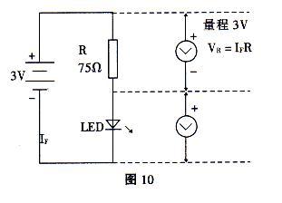 (2)外接电源测量。用3V稳压源或两节串联的干电池及万用表(指针式或数字式皆可)可以较准确测量发光二极管的光、电特性。为此可按图10所示连接电路即可。如果测得VF在1.4~3V之间,且发光亮度正常,可以说明发光正常。如果测得VF=0或VF≈3V,且不发光,说明发光管已坏。