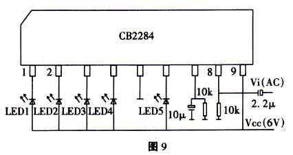 (5)电平表。目前,在音响设备中大量使用LED电平表。它是利用多只发光管指示输出信号电平的,即发光的LED数目不同,则表示输出电平的变化。图9是由5只发光二极管构成的电平表。当输入信号电平很低时,全不发光。输入信号电平增大时,首先LED1亮,再增大LED2亮……。