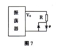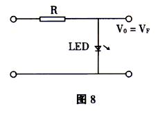 (3)单LED电平指示电路。在放大器、振荡器或脉冲数字电路的输出端,可用LED表示输出信号是否正常,如图7所示。R为限流电阻。只有当输出电压大于LED的阈值电压时,LED才可能发光。